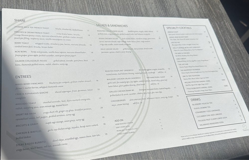 Tableau is a trendy American breakfast and brunch spot located in Costa Mesa, CA, offering a diverse menu with vegan options and environmentally friendly practices. The restaurant provides a range of dishes, from Avocado Toast to Chicken & Waffles, showcasing innovative flavors and unique twists on classic favorites. Customer reviews praise the Jasmine Milk Tea French Toast and Grilled Chicken Banh Mi Sandwich for their delicious taste and creative presentation. Additionally, the restaurant's modern and cozy atmosphere, attentive service, and convenient location within South Coast Plaza mall make it a top choice for a leisurely lunch or a special dinner. With options for outdoor seating, full bar service, and Wi-Fi accessibility, Tableau caters to a diverse range of preferences, making it a must-visit destination for food enthusiasts looking for a unique dining experience.